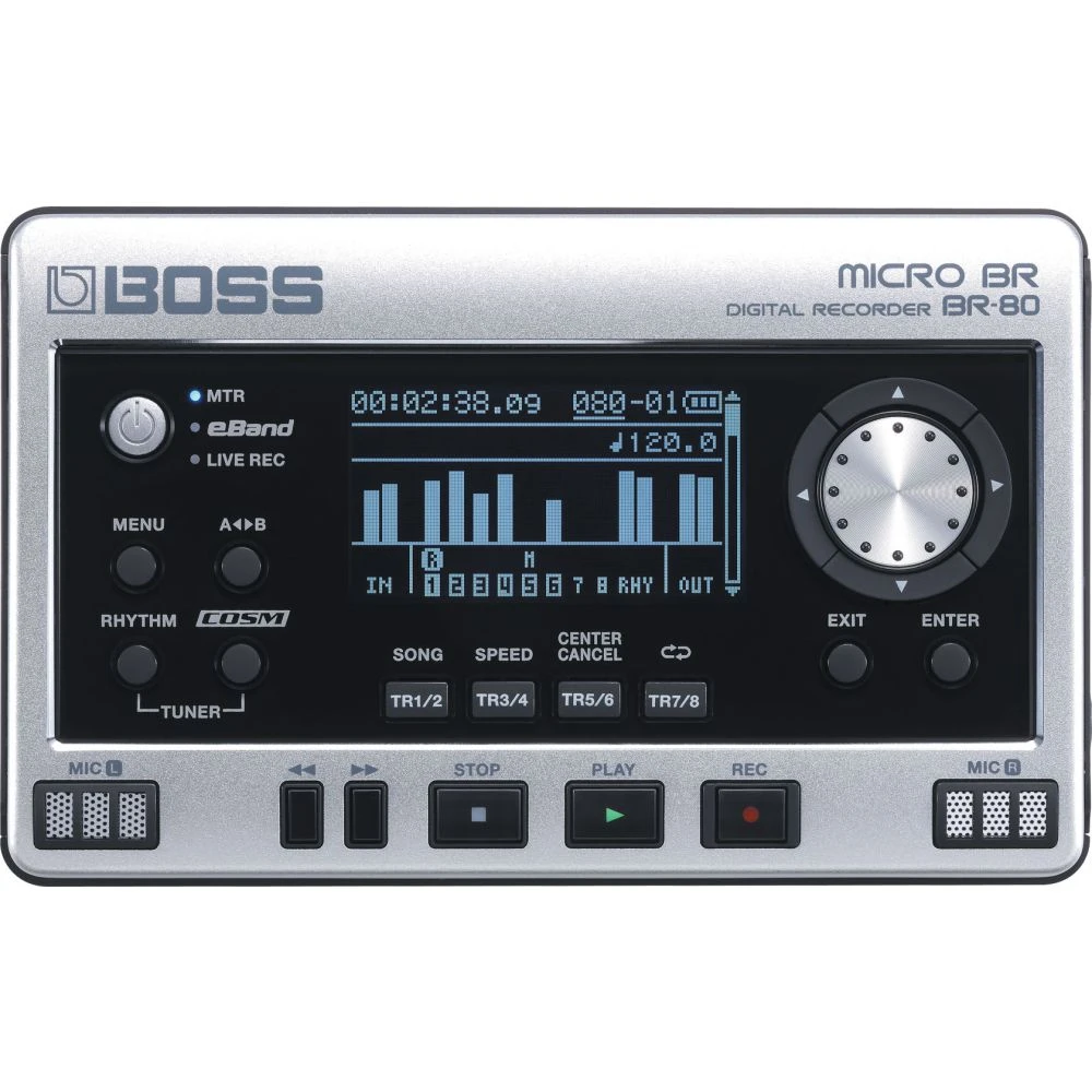 Small enough to fit in your pocket, the BOSS MICRO BR BR-80 is the ultimate new portable recording and jam-along tool for guitarists and other musicians. It’s equipped with three modes to create, record, and perform your music: an eight-track MTR (Multi-Track Recorder) mode; an eBand mode for onstage backing tracks and phrase training; and a Live Rec mode for instantly capturing high-quality stereo recordings. You can even combine the three modes seamlessly. Record your phrase ideas using Live Rec mode, for example, and then import the recordings into MTR mode to use as foundations for song production. Once you’ve added tracks, import your finished songs into eBand mode for backing-track accompaniment at the gig. The MICRO BR BR-80 is truly a must-have for all musicians!