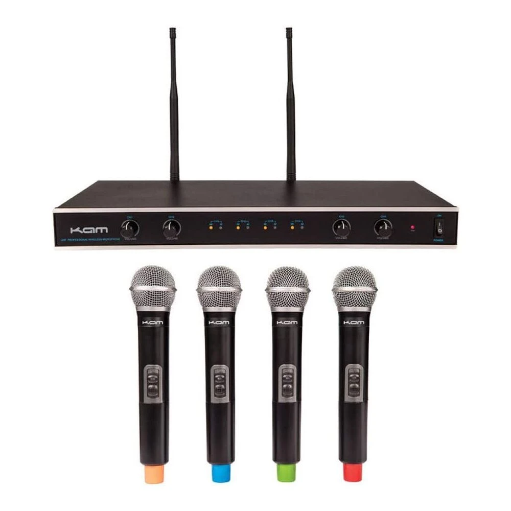 The Kam Quartet ECO Wireless Microphone System with 4 Mics is a 4 channel professional UHF wireless microphone system with 4 dynamic cardioid hand-held microphones and a UHF Multi-channel receiver.