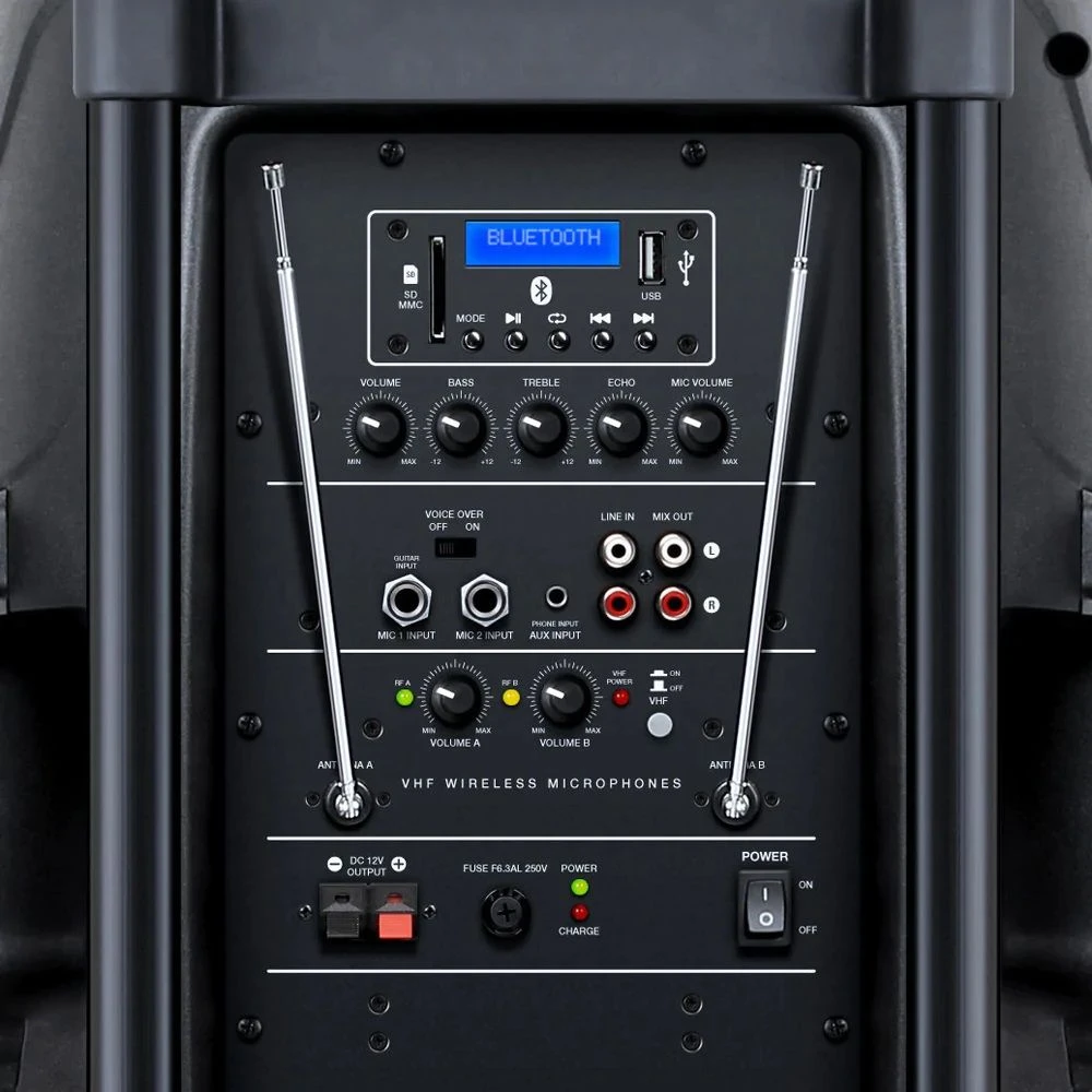 A 2-band EQ as well as an echo ensures that you can sculpt your sound to suit any room or situation. The attached wheels and handle makes this incredibly easy to transport.