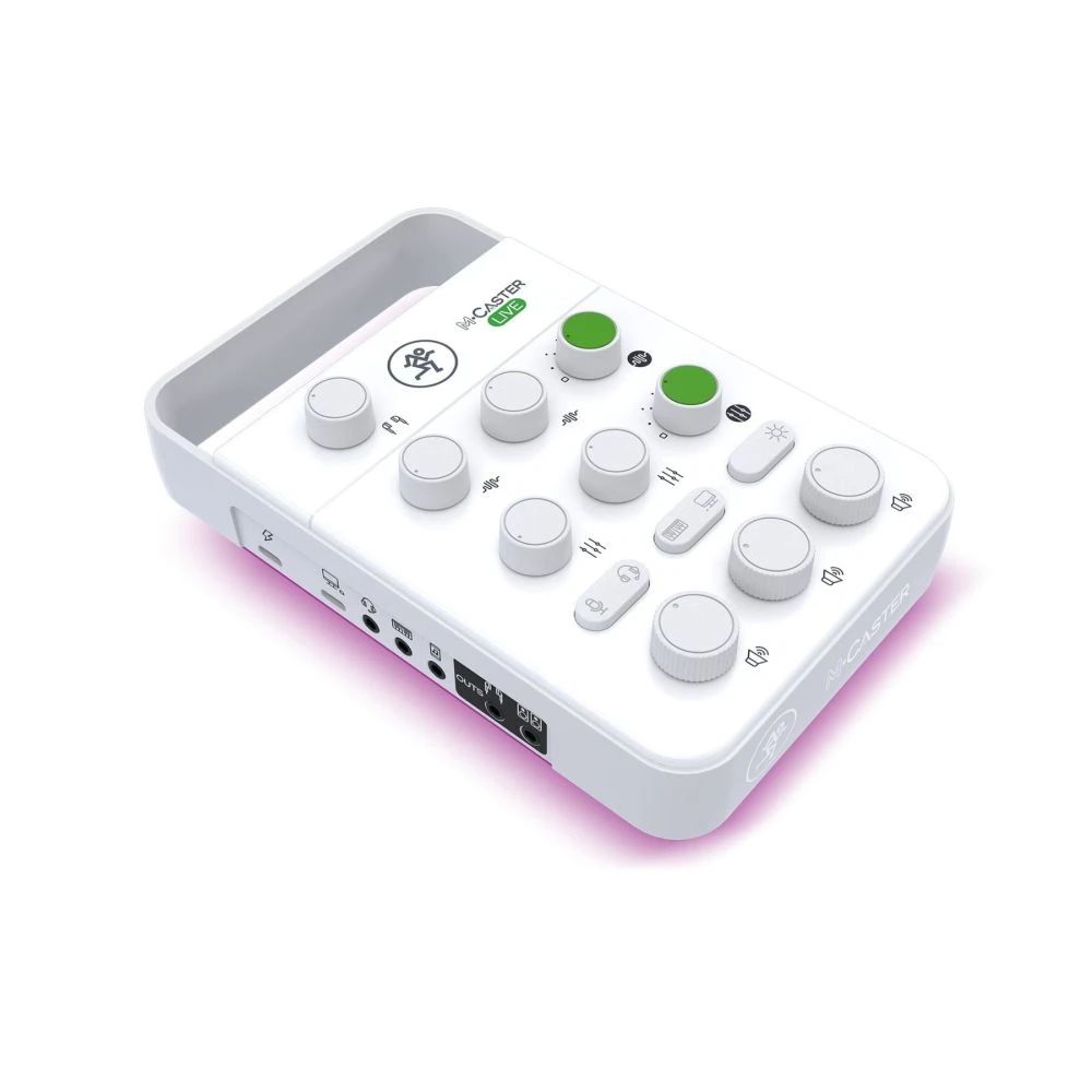 An exceptionally convenient audio solution for streaming via mobile devices, the Mackie M-Caster Live, seen here in the white finish, is a practical live streaming mixer that can be easily taken anywhere you go. Giving users the ability to simply plug in their microphone, tweak and adjust their sound and go, creating and streaming to a professional level has never been easier.