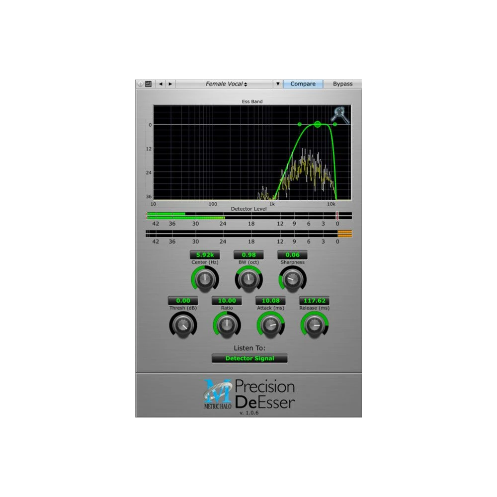 Precision DeEsser features comprehensive listening controls to allow you to hear exactly what is (or isn’t) being removed; you may choose five different points in the processing chain to monitor. As with all Metric Halo plug-ins, parameters are fully automatable to give you full control of the processing during mixdown.