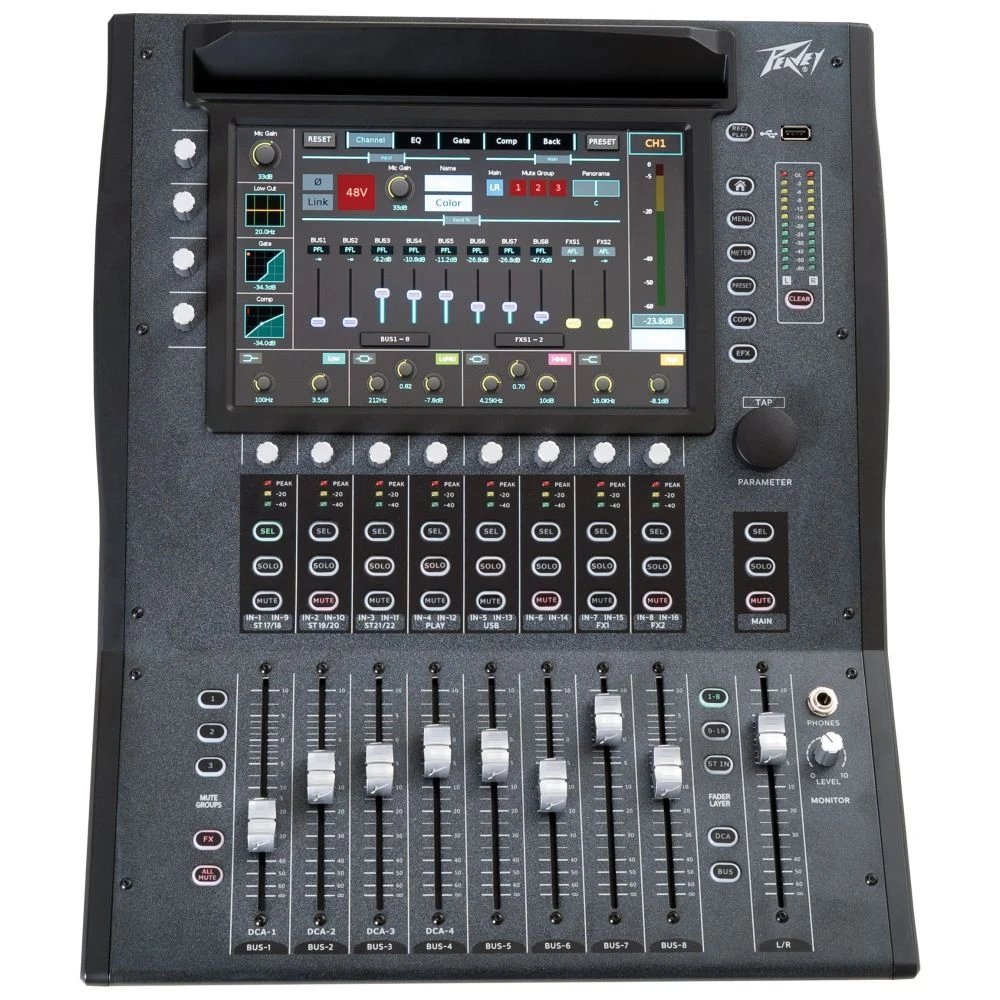 The Peavey Aureus 28 digital mixer offers pro-quality audio in a single compact unit. A 10″ touch screen delivers easy access to all of its simple functions.