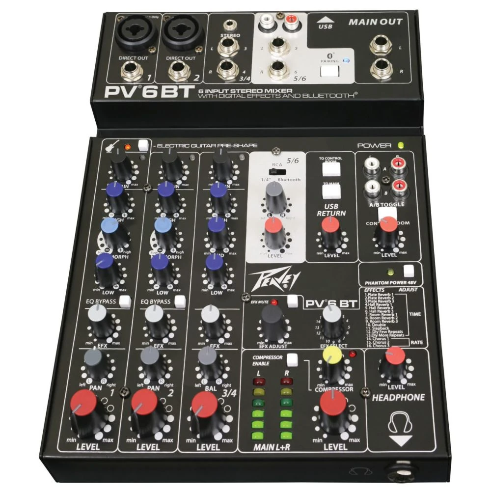 The PV 6 BT mixer includes 2 channels of reference-quality mic preamps, 2 direct outputs for recording, a stereo input channel, and a dedicated media channel, and Bluetooth wireless input and high quality digital effects.