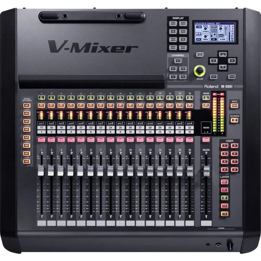 The M-200i, being part of the award winning heritage of Roland Professional Digital Audio consoles, ensures exceptional sound quality, intuitive operation and plenty of expandability. It is a Digital Console with 24 analogue inputs, 12 analogue outputs and stereo digital output (AES/EBU) all built-in to the main unit.