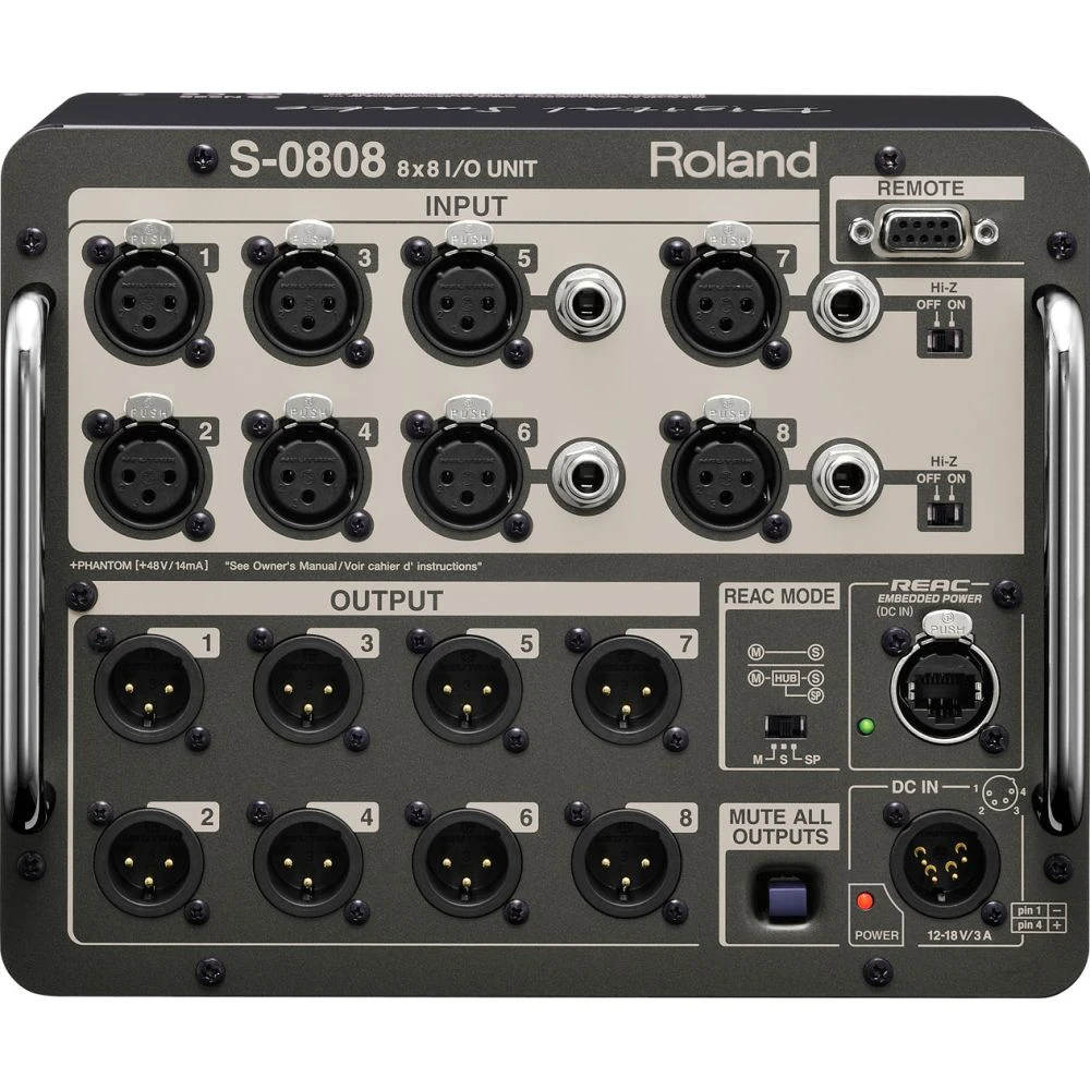 The Roland Systems S-0808 has unprecedented mobility enabling further convenience in many applications such as broadcast, event, live stage, audio installation and location sound. Enjoy flexibility in setup using external battery operation or power supplied over REAC. The S-0808 weighs around 3kg, making it portable and easy to setup. Rugged construction with steel handles withstands the rigors of live applications and frequent use. Fan-less design enables quiet operation in any environment. All inputs employ a high quality preamp with fully discreet circuit design resulting in outstanding sound. Eliminate the need for direct boxes by using the TRS or Hi-Z inputs. Control input gain (-65 to +10dBu), Pad and Phantom Power via a dedicated S-4000R Remote Controller or using the PC Remote Control Software (S-4000RCS). When using as part of a V-Mixing System, these parameters are controlled directly from the M-400 or M-380 V-Mixer.