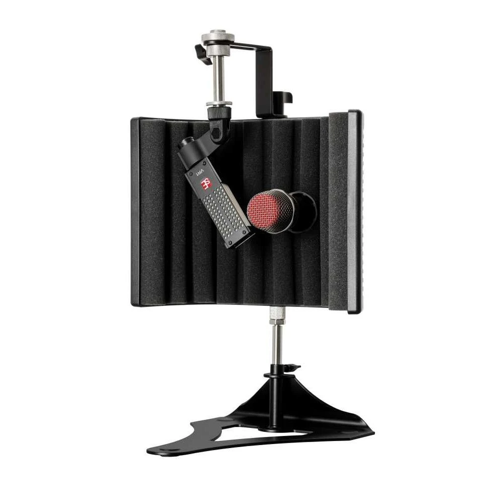 The guitaRF Reflection Filter is designed to fit just about any microphone you can think of. A top down mount fits all manner of dynamic, condenser and ribbon microphones while a small hole located at the back allows for pencil microphones to be fitted securely. A large base means that the guitaRF can be slid between or underneath amplifiers for convenient use on stage, at home or in the studio.