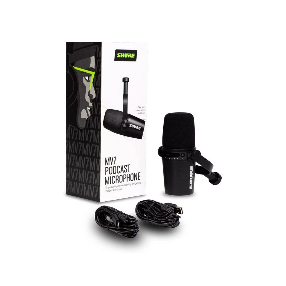 The Shure MV7 Podcast Microphone, seen here in a sleek Black finish, gives you professional sounding recordings, perfect for podcasting, wherever you record.