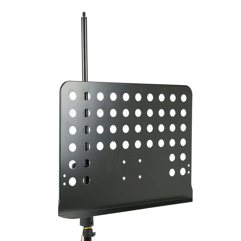 This perforated music stand comes with an attachable holder arm that has a clamp and locking screw so you can easily fix it your microphone stand.