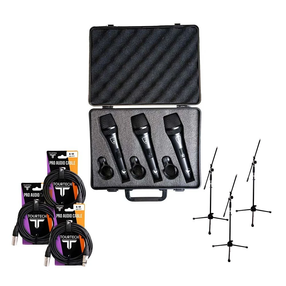 Coming with a trio of 6 metre XLR cables and three Tourtech mic stands, users have everything they need to get performing immediately.